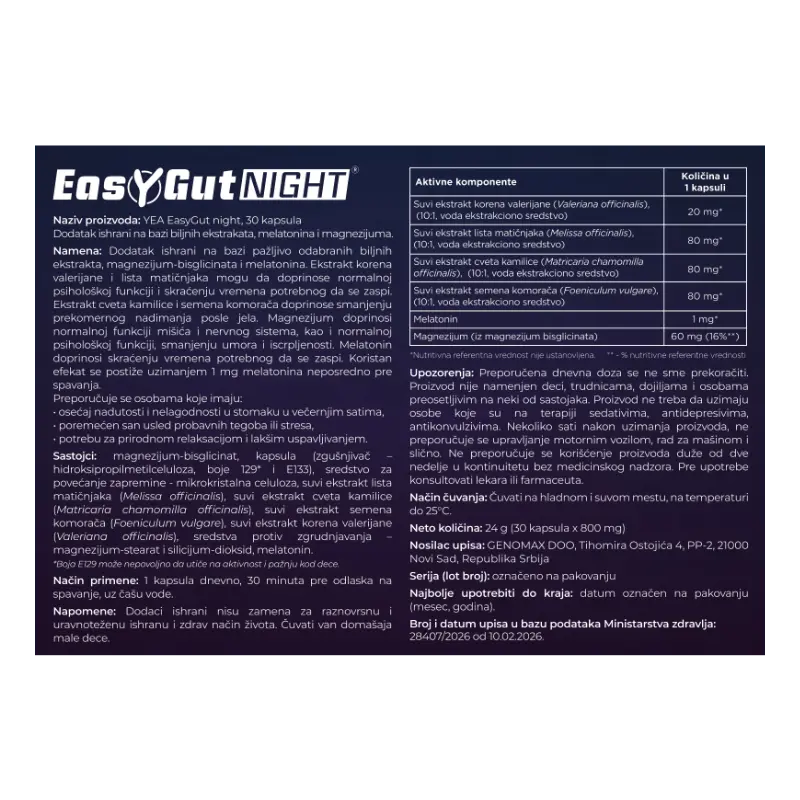 Naziv proizvoda: YEA EasyGut NIGHT, 30 kapsula, dodatak ishrani
