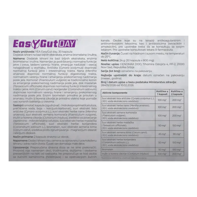 Naziv proizvoda: YEA EasyGut DAY, 30 kapsula, dodatak ishrani
